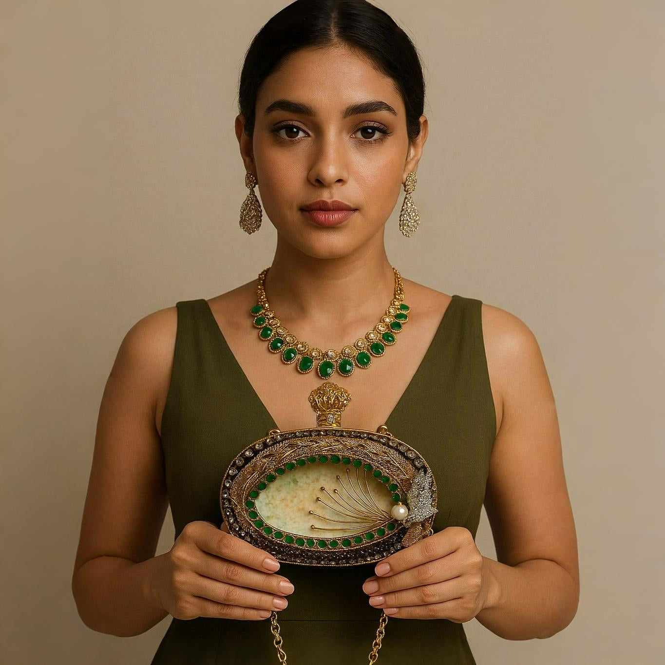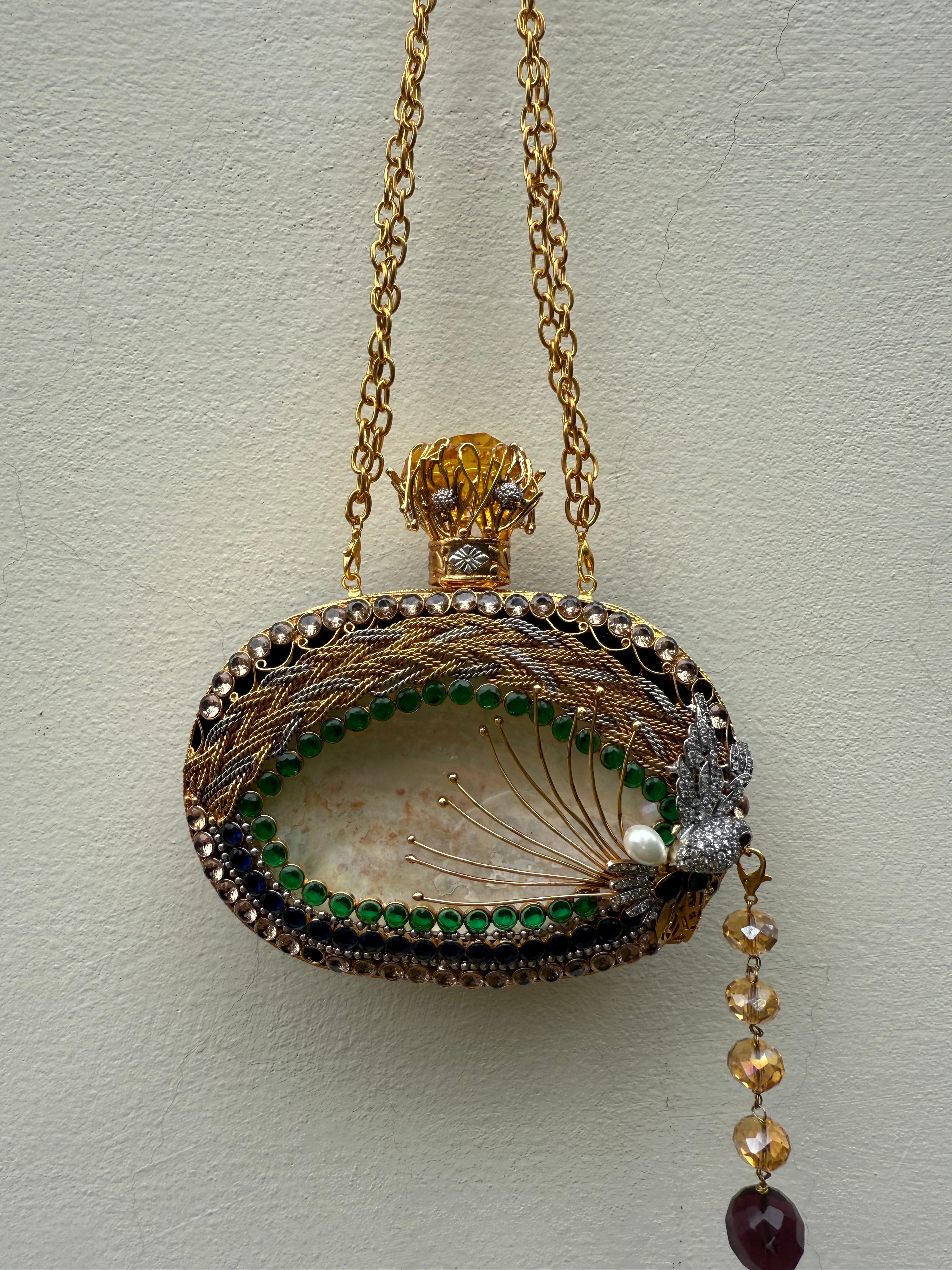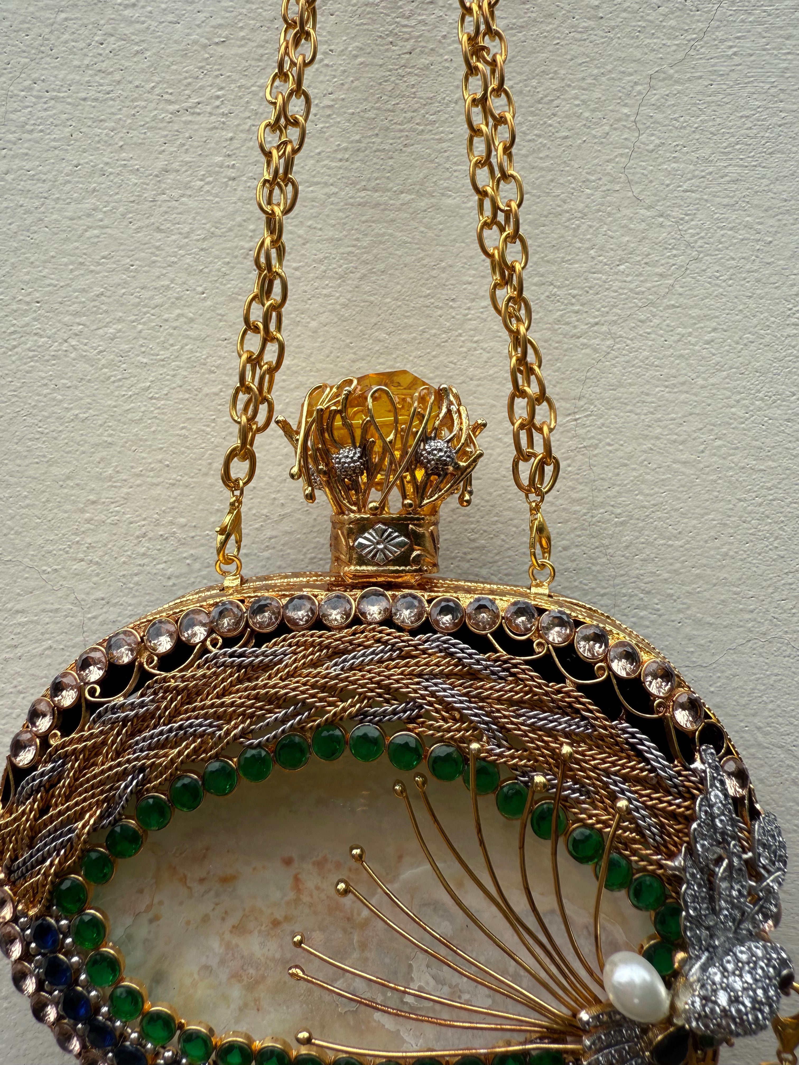 Expertly crafted with one side featuring mother of pearl and the other embellished with precious gems, our Double Sided Clutch adds a touch of elegance to any outfit. Made with 22k plated metal, this versatile clutch is the perfect accessory for any formal event or special occasion.