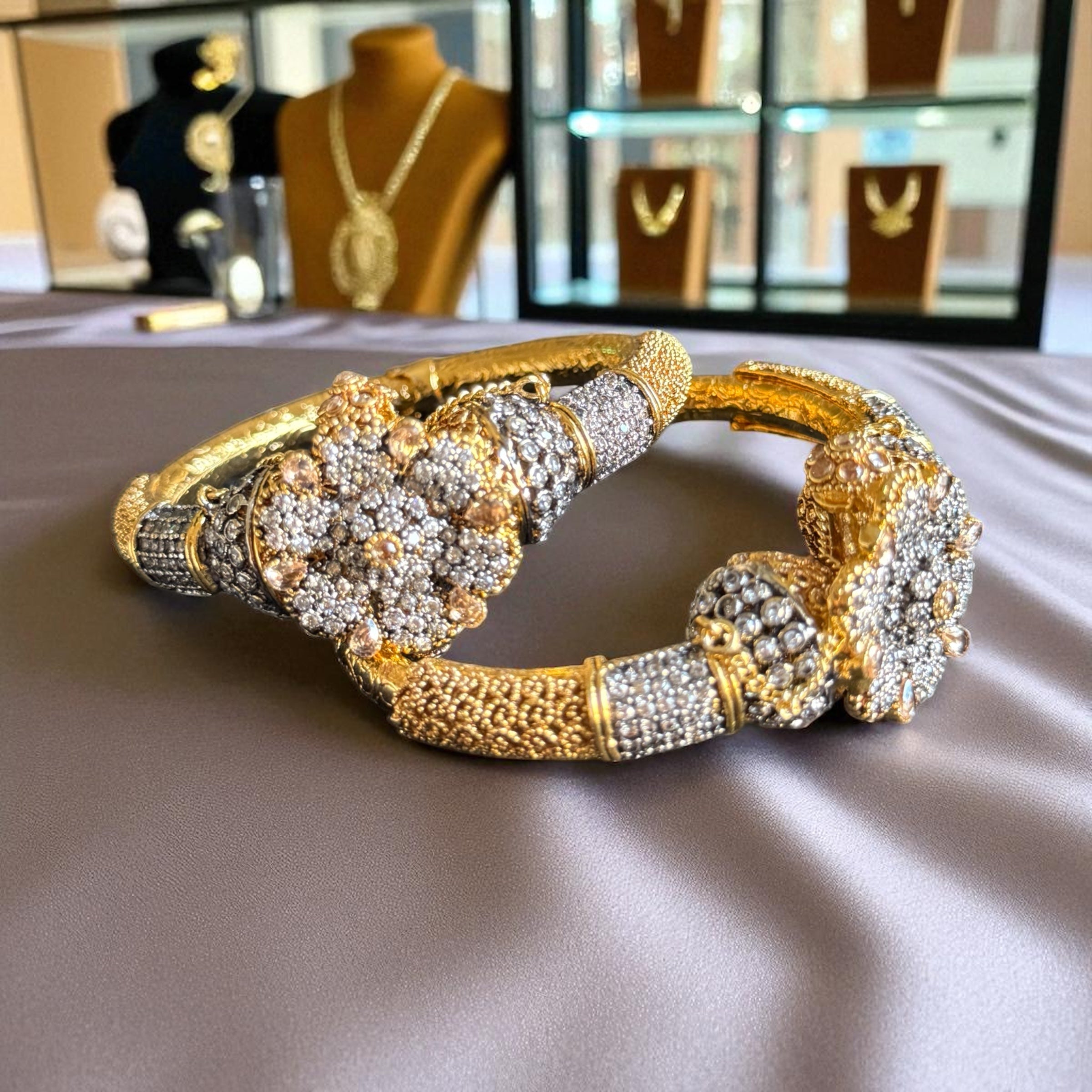 Elevate your wedding look with Floral Brides bangles. Made with 22 carat gold plating, this pair of bangles adds a touch of elegance to your outfit. Perfect for the modern bride looking for a timeless accessory.