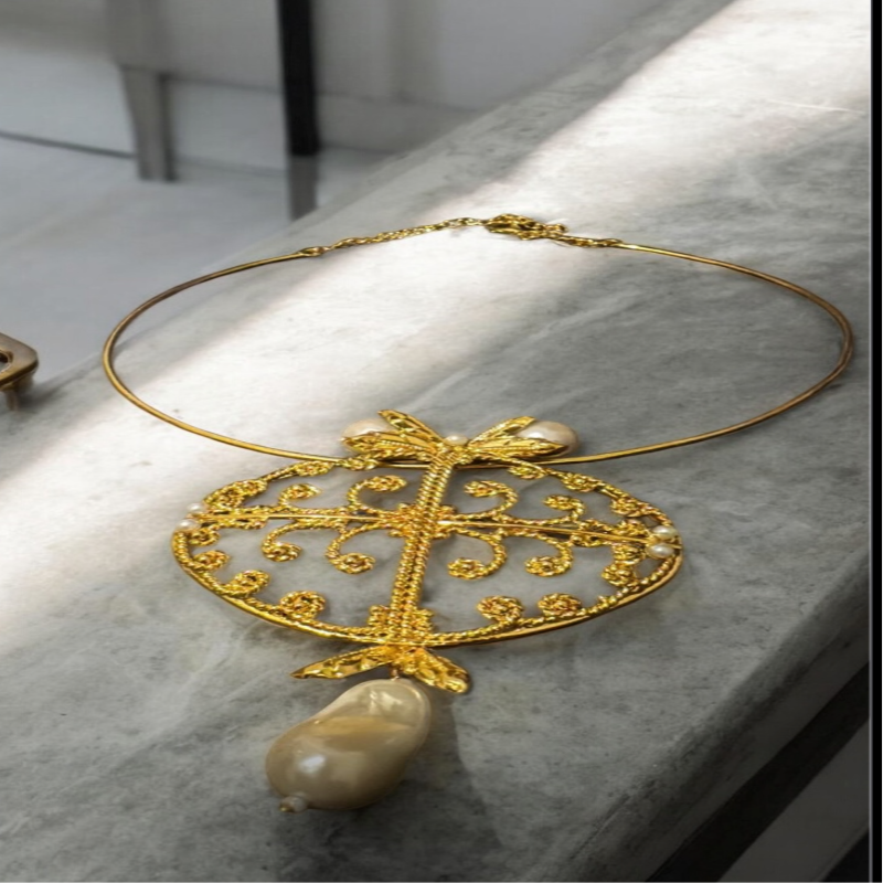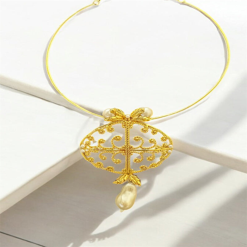 Elevate your style with our Hasli choker adorned with a stunning baroque pearl. The intricate design of the hasli adds a touch of elegance, while the pearl hangs delicately for a classic look. Perfect for adding a sophisticated touch to any outfit.