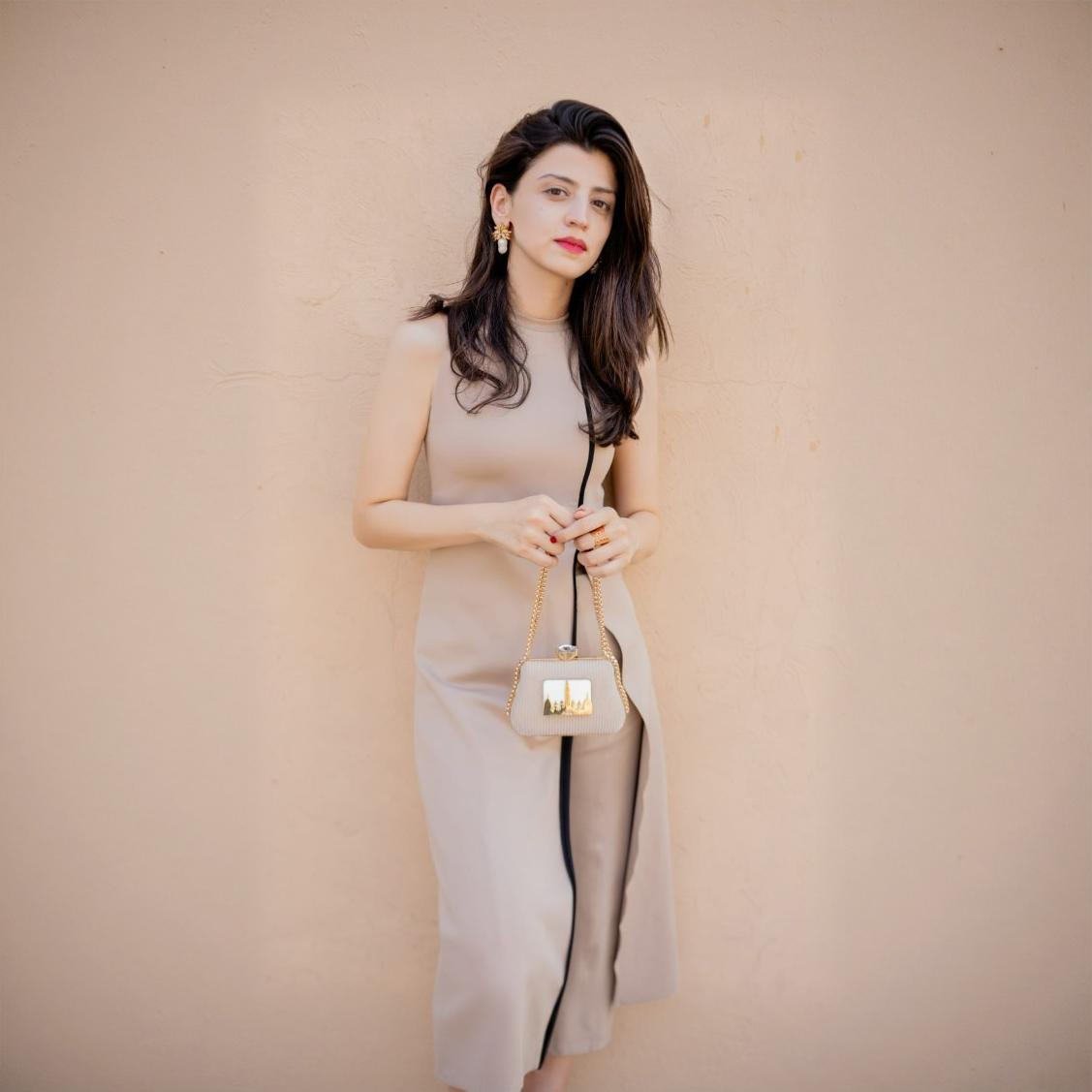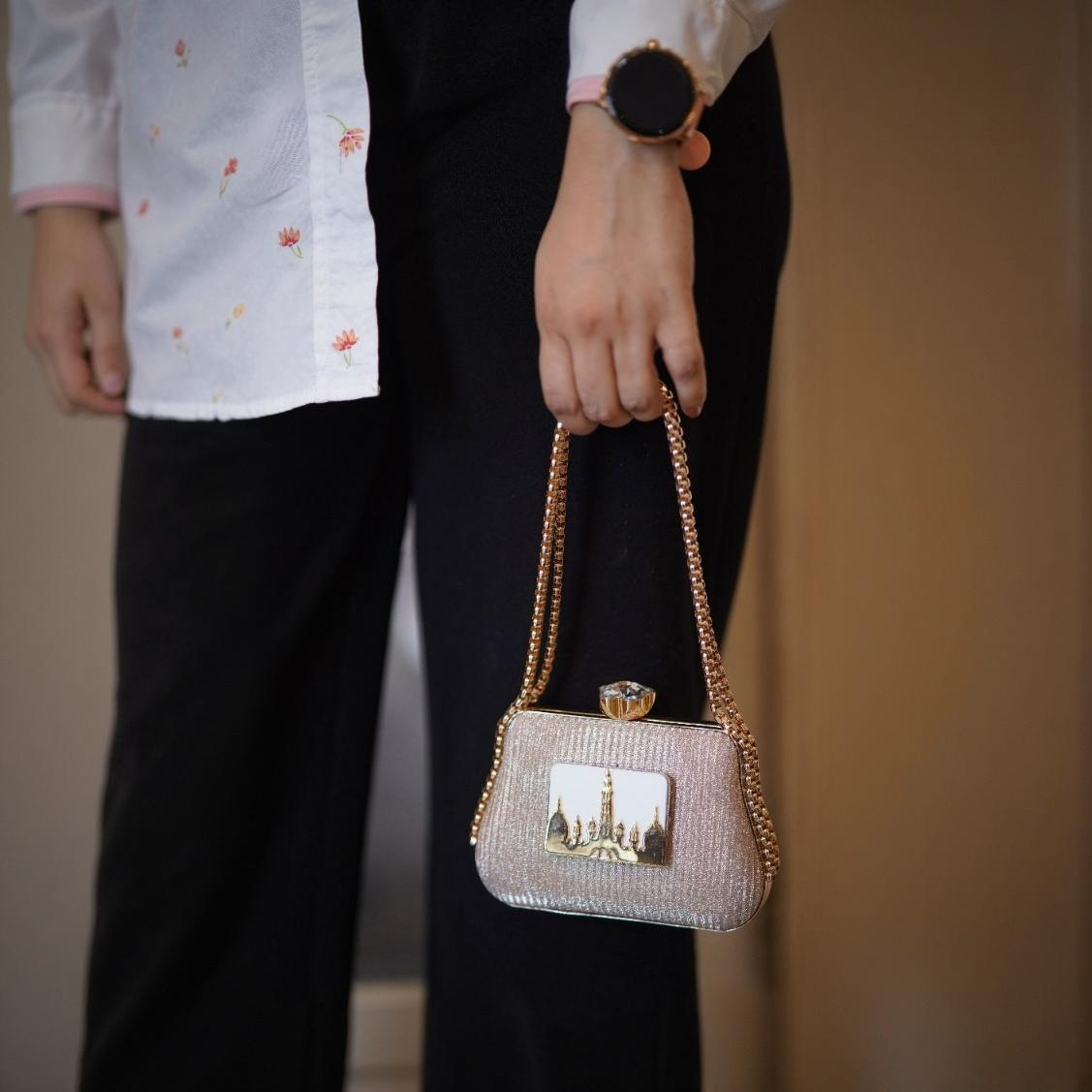 This elegant clutch celebrates heritage with a golden motif of the iconic Minar-e-Pakistan, set against a fabricated-textured base. Finished with a crystal clasp and a sleek chain strap, it blends cultural pride with timeless sophistication — a true statement accessory.