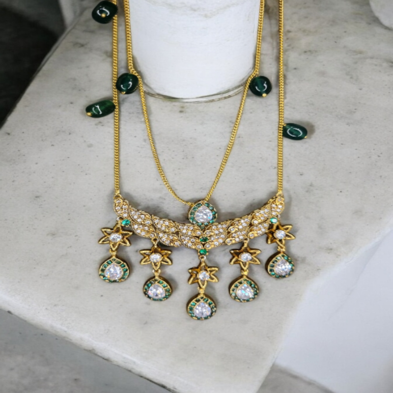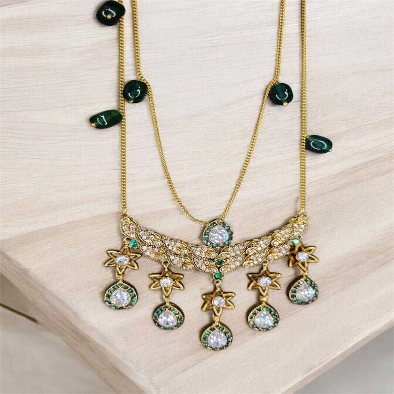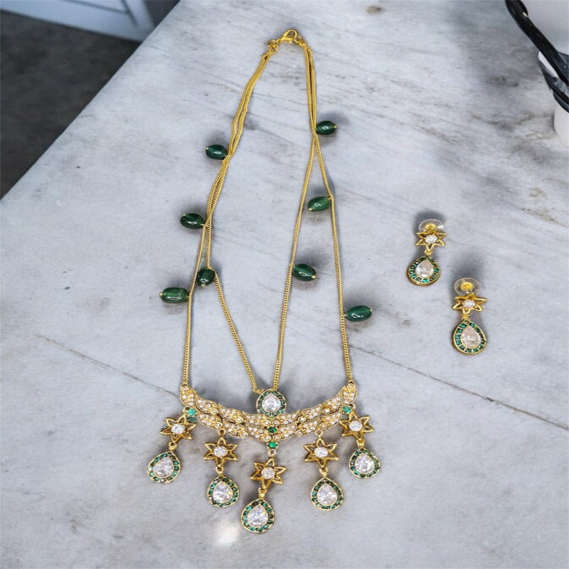 A stunning double-chain nenecklac with earrings featuring a harmonious blend of golden and silver hues, adorned with a captivating emerald centerpiece. Each motif exudes elegance, combining intricate craftsmanship with timeless charm. The set is complemented by matching earrings that echo the necklace's sophisticated design, creating a perfect balance of luxury and grace. Ideal for special occasions, this set adds a touch of regal beauty to any ensemble.