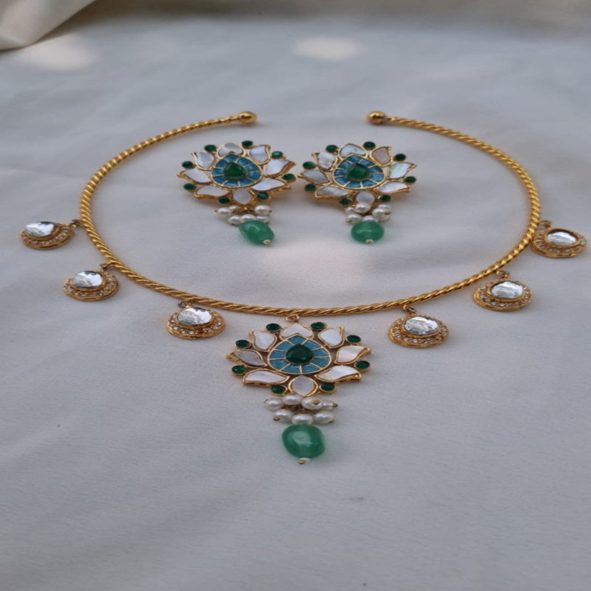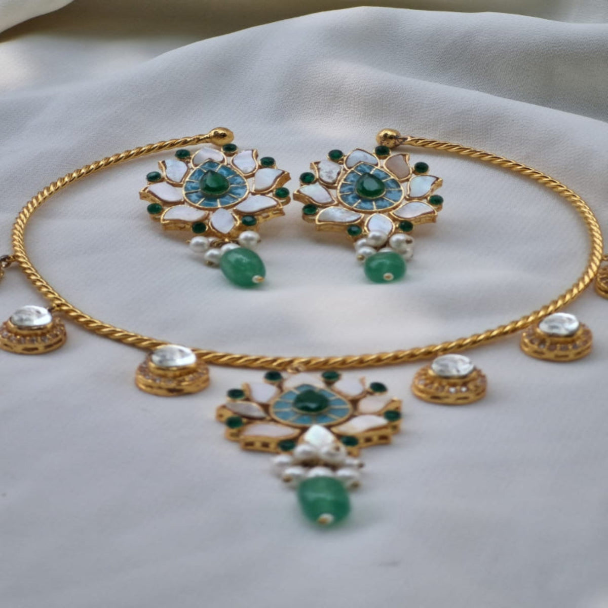 Discover the elegant beauty of MorHas, featuring a stunning Peacock hasli set with mother of pearl accents and a luxurious 22k plating. Enhance your style with this expertly crafted piece, sure to stand out and elevate any outfit.