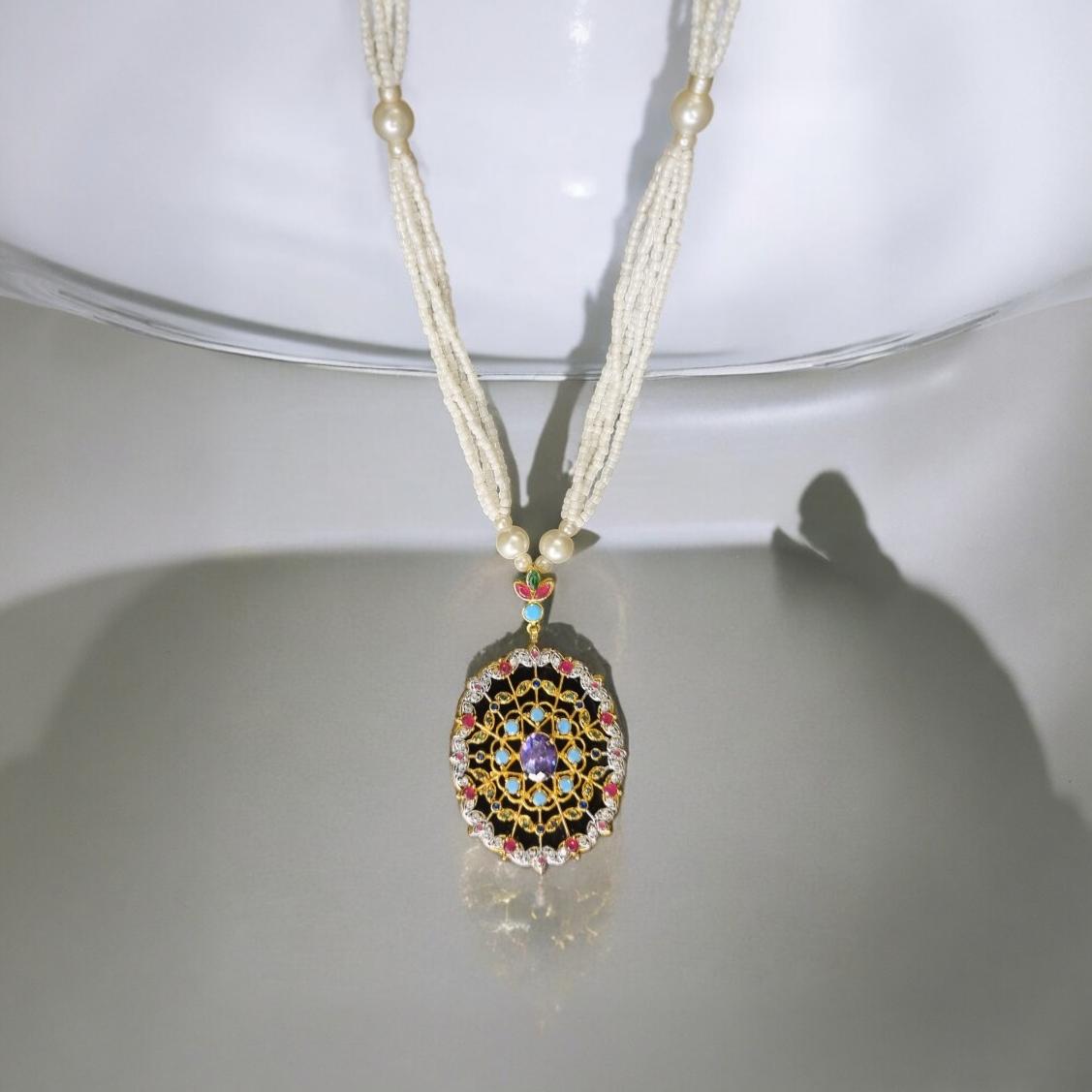 Introducing the Onyx Mala - a stunning piece made with onyx gemstones and accented with 22k gold plated pearls, rubies, emeralds, and firozas. Experience the benefits of this combination, believed to promote balance, grounding, and protection. Elevate your style and your well-being with this exquisite mala.