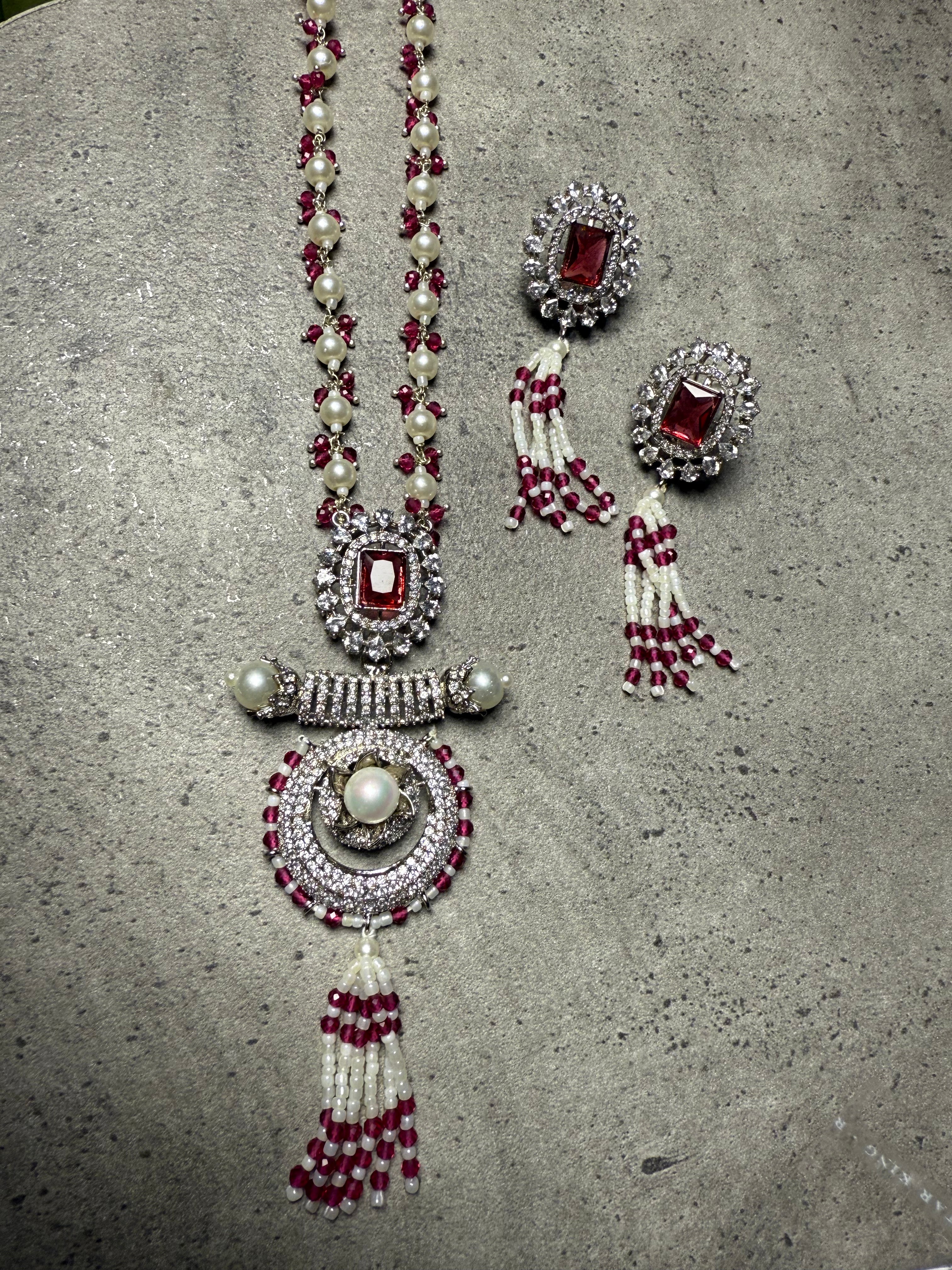 This elegant necklace and earring set, Pink Majesty, features a stunning combination of ruby and zircons. The result is a beautiful and eye-catching accessory that adds a touch of sophistication to any outfit. Perfect for formal occasions or adding a touch of glamour to your everyday style.