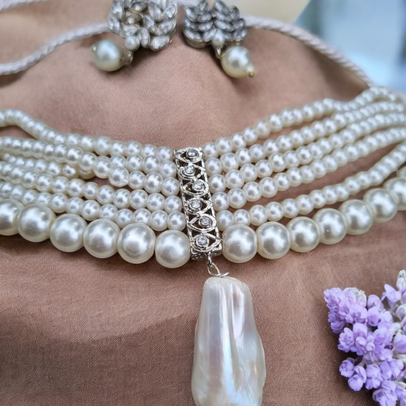 This beautiful choker features delicate freshwater pearls and stunning hanging baroque pearls. Its zirconium earrings add an elegant touch to any outfit. Perfect for special occasions or adding a touch of sophistication to your everyday look. Experience the timeless beauty and luxury of genuine pearls.