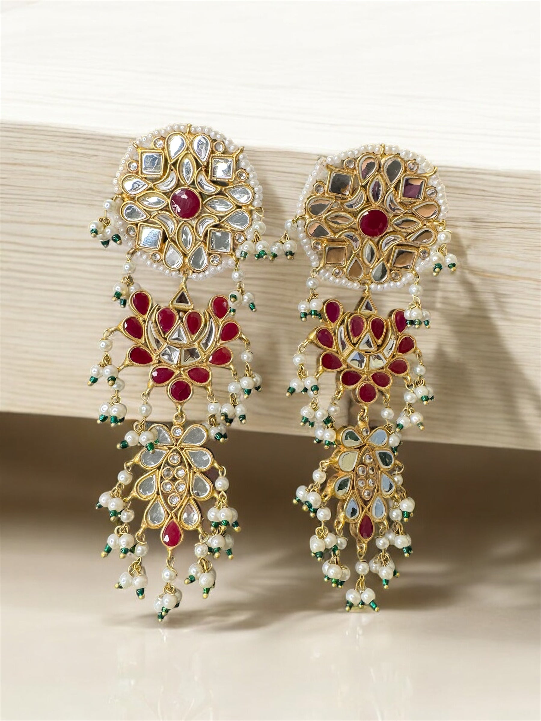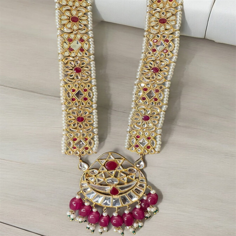 Introducing the RaniHaar, a stunning piece of jewelry that exudes elegance and royalty. This traditional rani haar is intricately designed with kundan and 22k gold plating, complemented with beautiful rubies. Elevate your style and make a statement with this opulent piece.