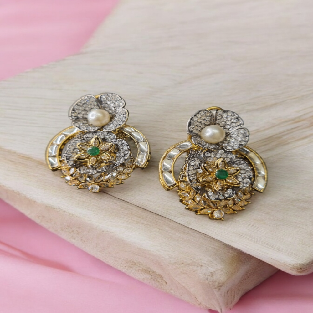 Enhance your style with Royal Gleam's Exquisite Kundan Ear Studs. Featuring champagne and Belgium zircons, these intricately crafted studs exude traditional charm and modern sophistication. Made with a luxurious 22K gold-plated finish, they add a radiant sparkle to any occasion. Elevate your look with these elegant studs.