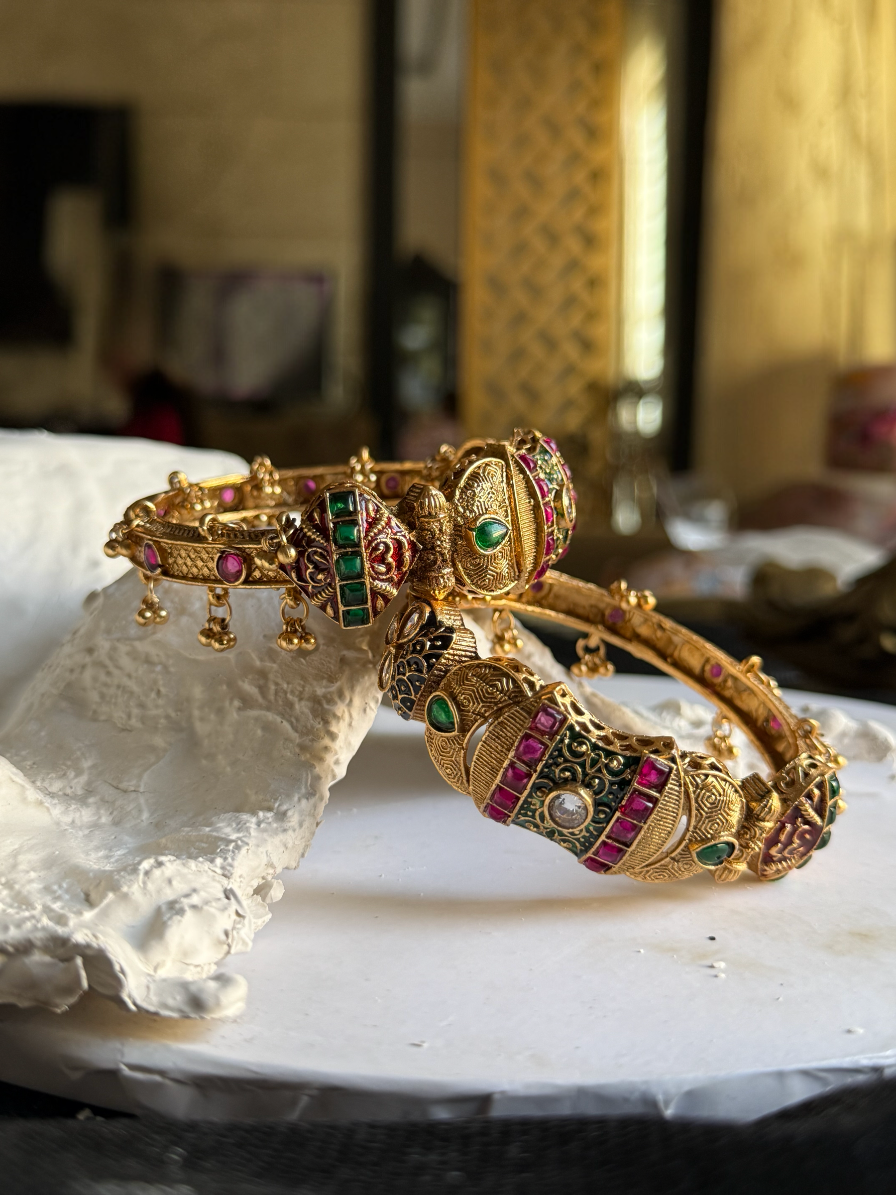 Expertly crafted, these Tabeer bangles exude elegance and luxury. Made with 22 carat gold plating, the intricate carving and precious gemstones add a touch of glamour to any outfit. Elevate your style with these stunning bangles.