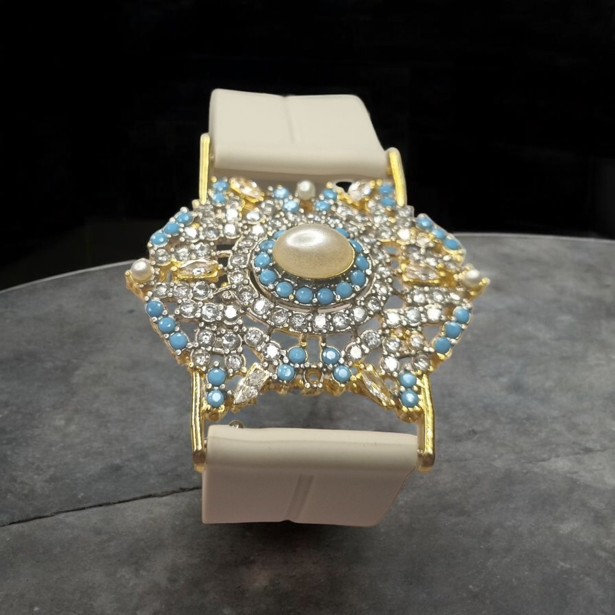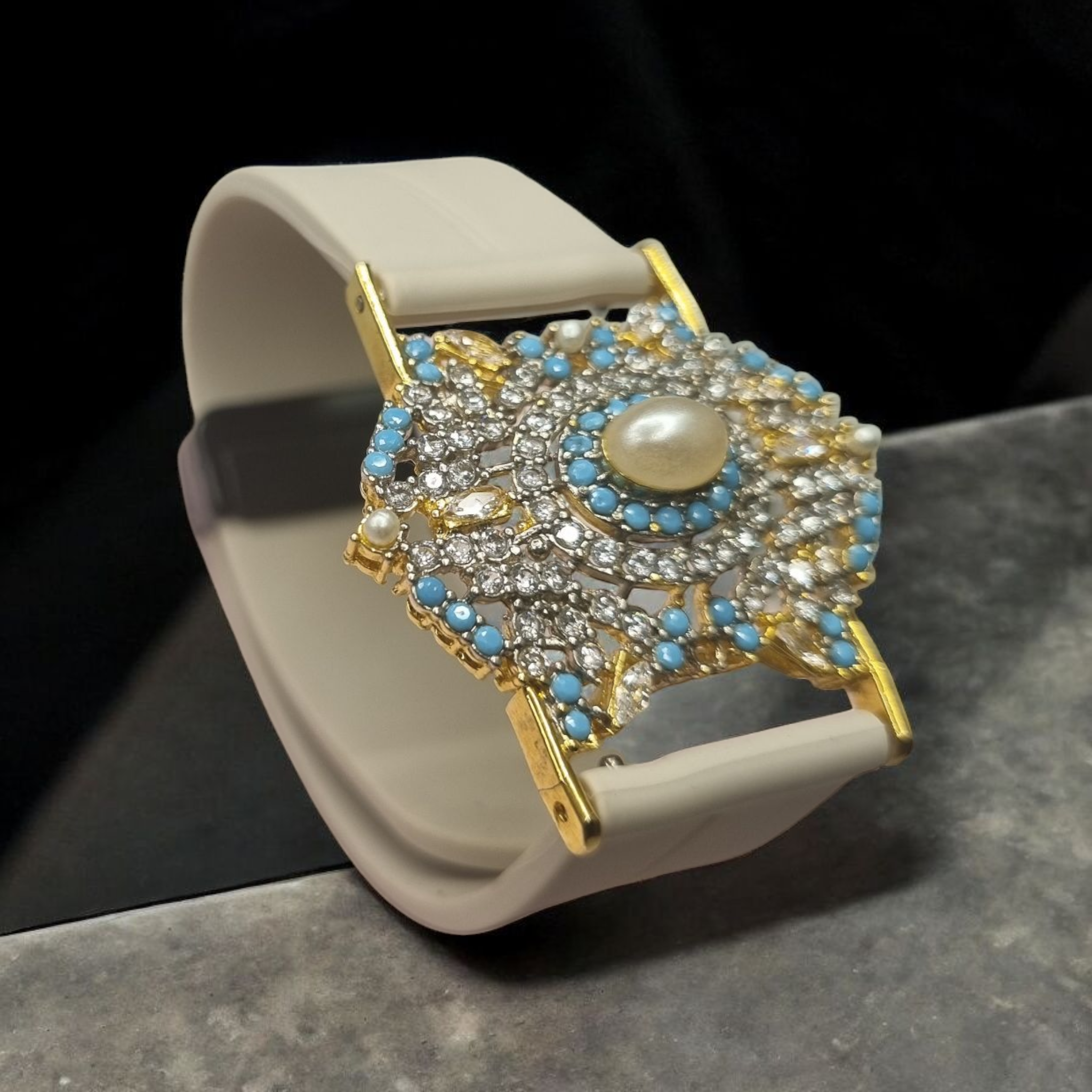 Upgrade your style with this elegant and versatile silicon band featuring beautiful feroza and pearl embellishments, accented with sparkling zircon stones. The perfect combination of fashion and functionality, this band is suitable for any occasion and adds a touch of sophistication to any outfit.